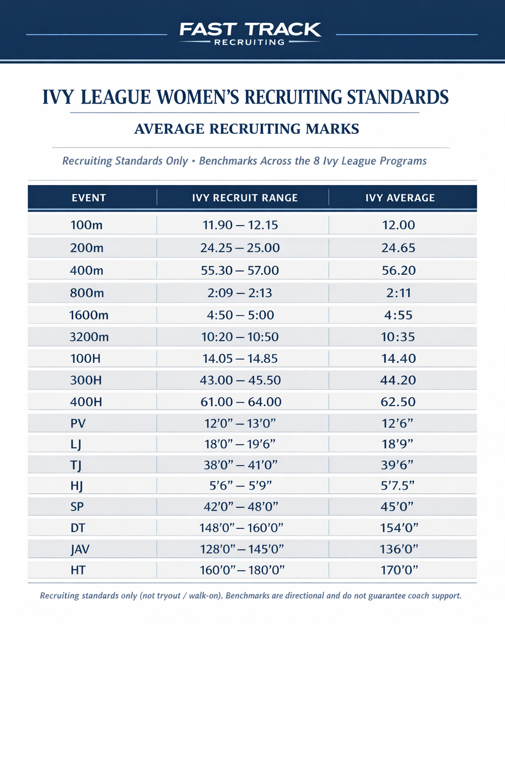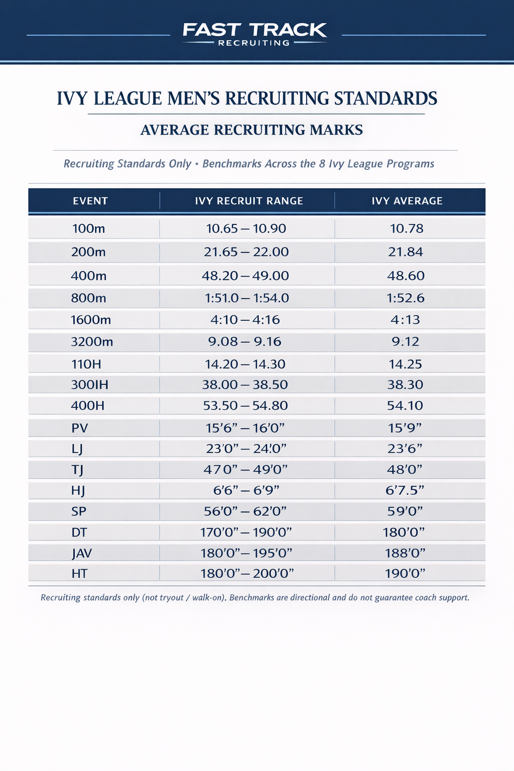 Select a school below to view recruiting standards, times, marks, and Fast Track Recruiting insights for each Ivy League program.