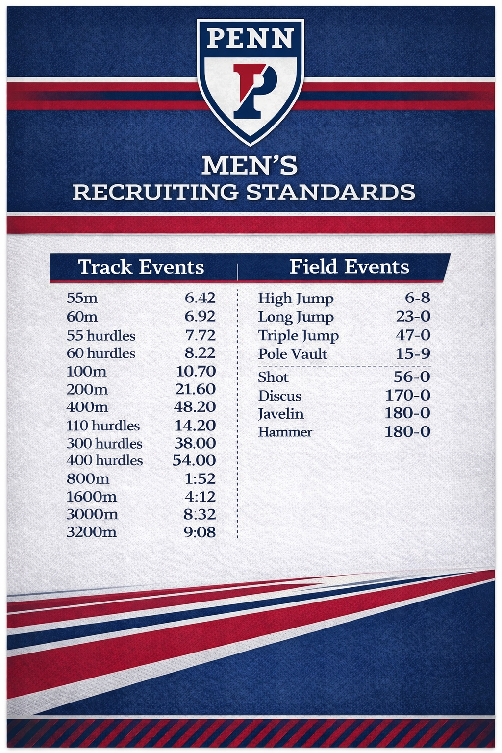 Penn sits in a particularly competitive lane within the Ivy League because it combines elite academics, a major-city setting, strong overall school brand recognition, and a program that often attracts athletes who could also be viable at other highly selective Division I institutions. That means listed or projected standards should be treated as benchmarks — not guarantees. In many cases, athletes who appear “on standard” still need strong academics, event-specific need, and strong communication timing to become realistic Penn recruits.