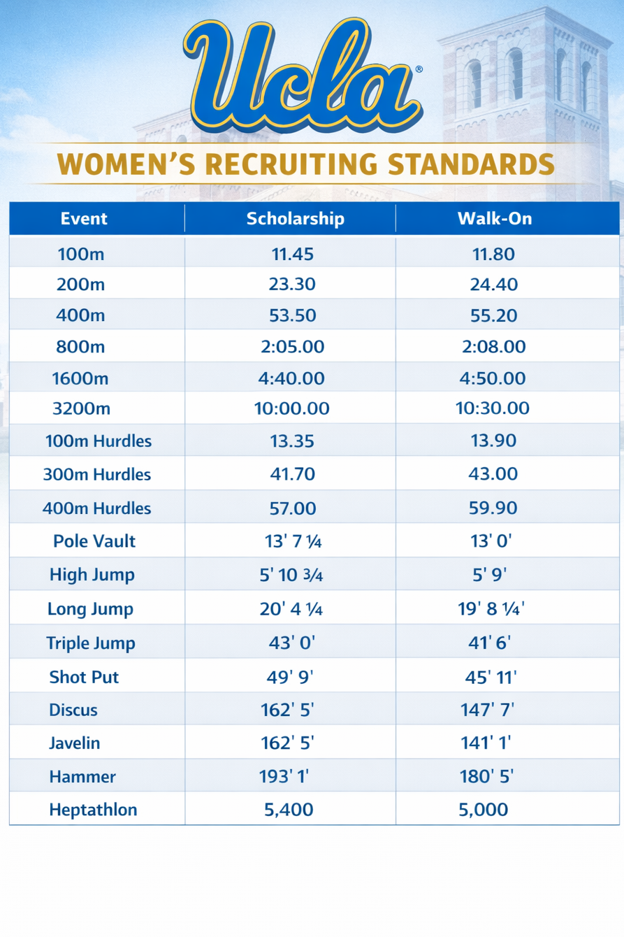 Below are UCLA’s women’s recruiting standards. These marks provide a strong reference point for athletes and families trying to understand where they may fit in UCLA’s recruiting landscape. That said, at a nationally competitive program like UCLA, recruiting decisions are never based on marks alone. Coaches evaluate athletes in the context of roster need, event-group balance, developmental upside, transfer portal movement, and overall fit within the team’s recruiting priorities.
