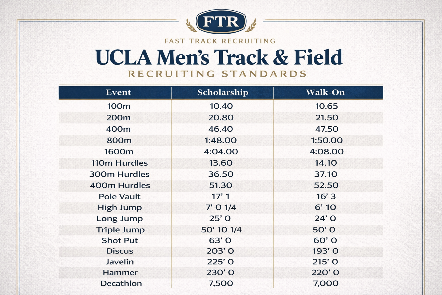 Families comparing UCLA with other nationally competitive Division I programs should also review our USC Track and Field Recruiting Standards, Stanford Track and Field Recruiting Standards, Michigan Track and Field Recruiting Standards, and Ivy League Track and Field Recruiting Standards pages.