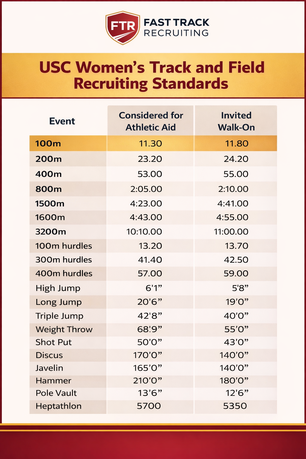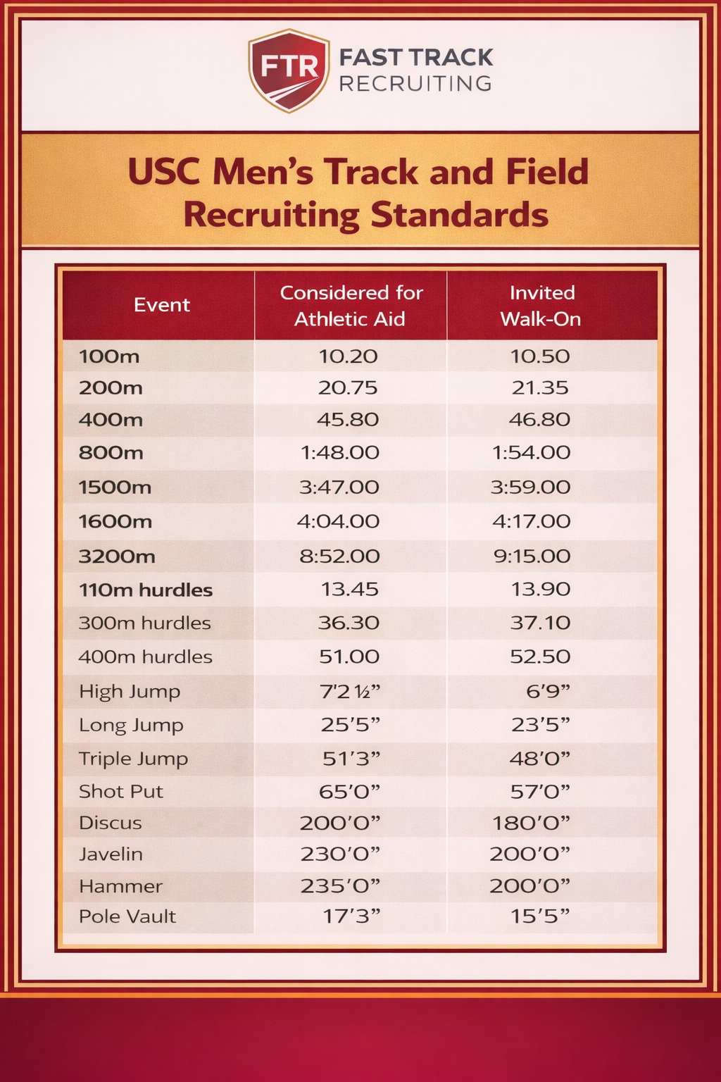 USC is one of the premier track and field programs in the country and has long been one of the most competitive destinations in college recruiting — particularly in sprint, hurdle, jump, and power-event groups. For prospective student-athletes, it is important to understand that USC’s recruiting standards reflect a program competing for elite national talent. The marks below provide a strong reference point for the levels typically associated with athletes who may be considered for athletic aid versus those who may be viable invited walk-on candidates.